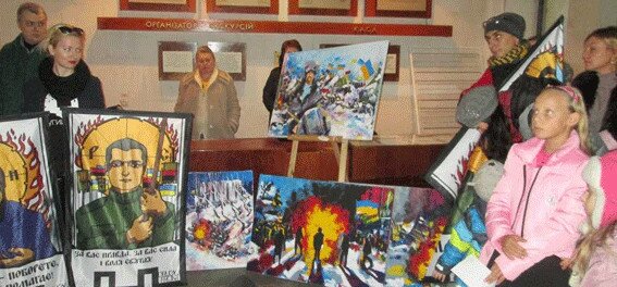 Розповідаючи про проект та про себе, ще зовсім юна художниця Марія Діоргійчук поділилась із журналістами: „Безпосередньо, коли розпочалася ця кривава історія в нашій державі, я разом із іншими художниками була на Майдані, де ми робили замальовки, так би мовити закарбовували на полотні нашу історію. Тепер я знаю, як це працювати на війні, коли біля тебе вибухають світлошумові гранати та усе палає…“На Майдані митці встигли оранізувати кілька виставок, які було знищено вщент після того, як Український дім було захоплено вдруге.